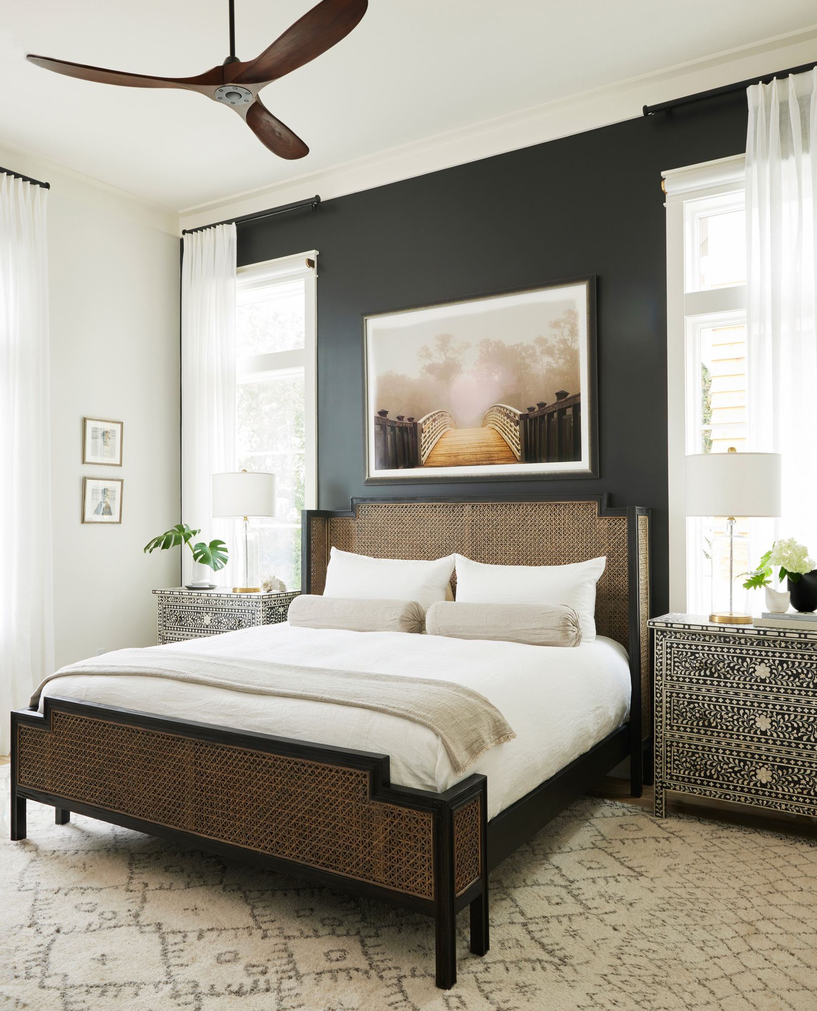 The same vocabulary of textures, layered finishes, and confident strokes of black and white continues in the primary suite, creating a serene mood. Tall windows, a favorite photograph of Western Lake above the bed, and matching end tables with an ornate bone- inlaid pattern complement another black accent wall.