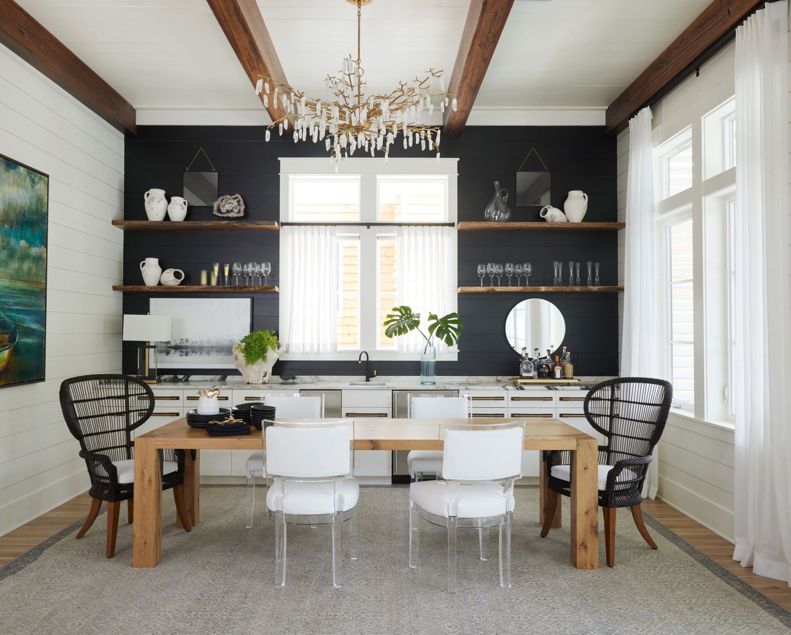 Living areas flow one to another, organically designated by layered details and furniture placement. A black accent wall with a built-in buffet echoing the mood and manners of the kitchen defines the inviting dining area. A large window with sheer curtains and floating shelves for storage and display enliven the space.