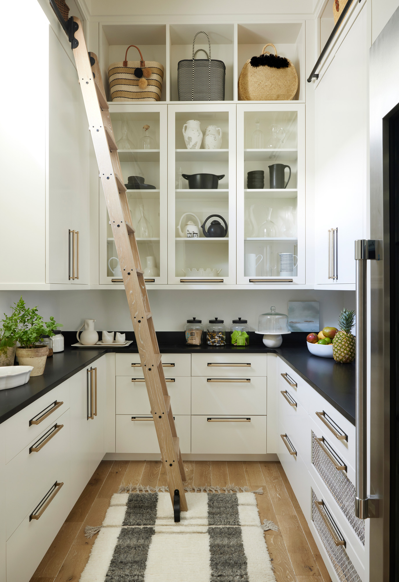 “A sleek, black Venetian plaster range hood and oversized gold-and-black cabinet hardware offer visual counterpoints to the white cabinets that were already specified,”
