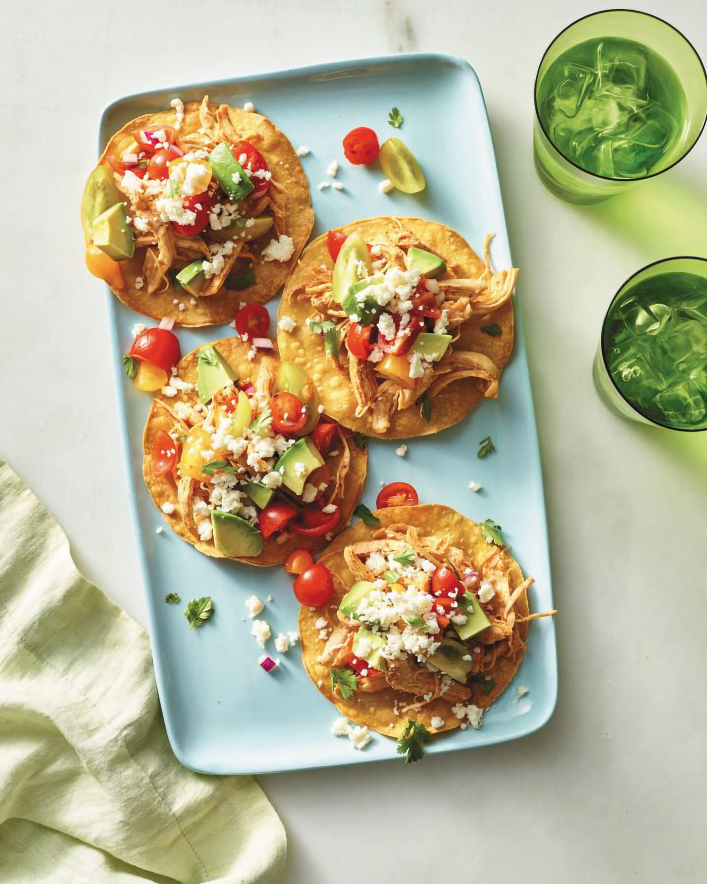 Turn the pressure release valve to the venting position to quickly release the pressure (steam) from the cooker until the float valve drops. Carefully remove the lid. Transfer the chicken breasts to a cutting board or plate and let cool for 5 minutes. Meanwhile, lightly coat both sides of each tortilla with cooking spray; place on the prepared baking sheet. Bake the tortillas until lightly browned and crisp, 10 to 15 minutes, turning once. During the last 5 minutes of baking, shred the chicken with two forks. Top each tortilla with 1 /4 cup of the shredded chicken, about 3 tablespoons of the avocado mixture, and 11 /2 teaspoons of the cheese. Garnish with cilantro, if desired.