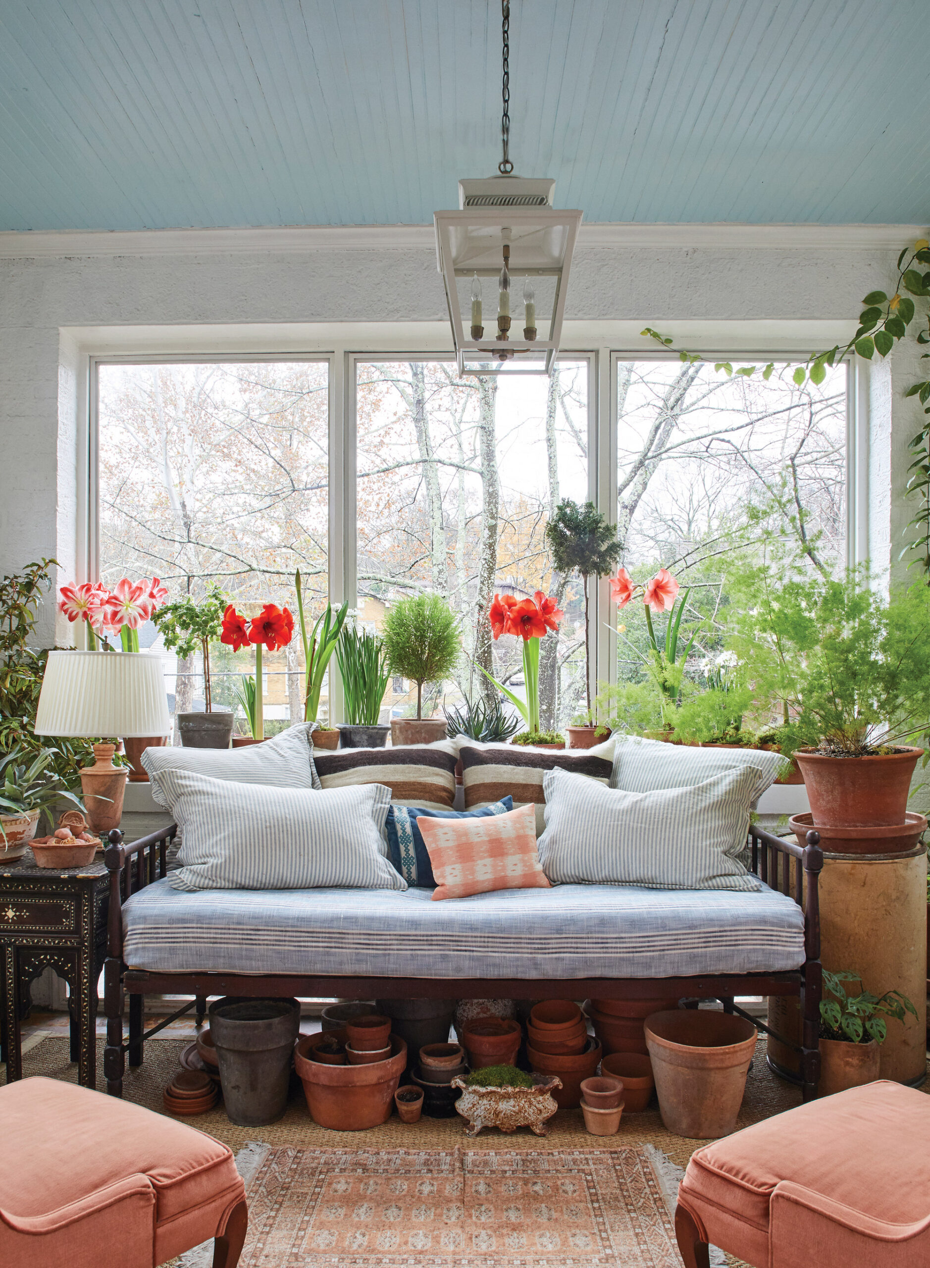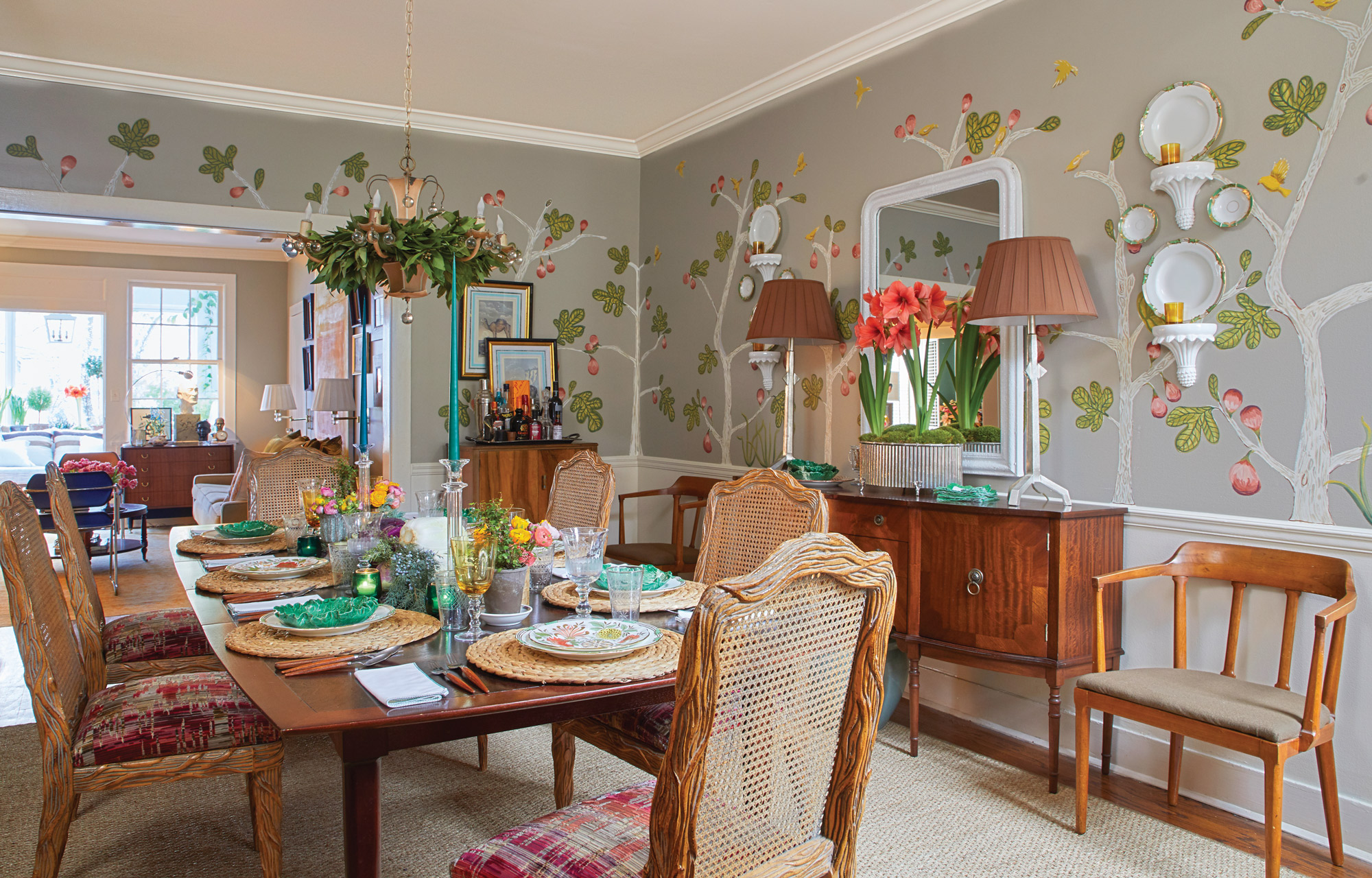 It’s no surprise, then, that during the holidays, their townhome, located a short walk from the store, becomes a showplace for decadent displays of seasonal flora and fauna. Everything from mantels and windows to doorways and chandeliers is twirled up with boughs of boxwood, magnolia, fir, pine, and more. Meanwhile, winter blooms such as amaryllis, paperwhites, and poinsettias punctuate tabletops and shelves at every turn. “We’re less about glitz and more about bringing the outdoors in this time of year,” says Mark.