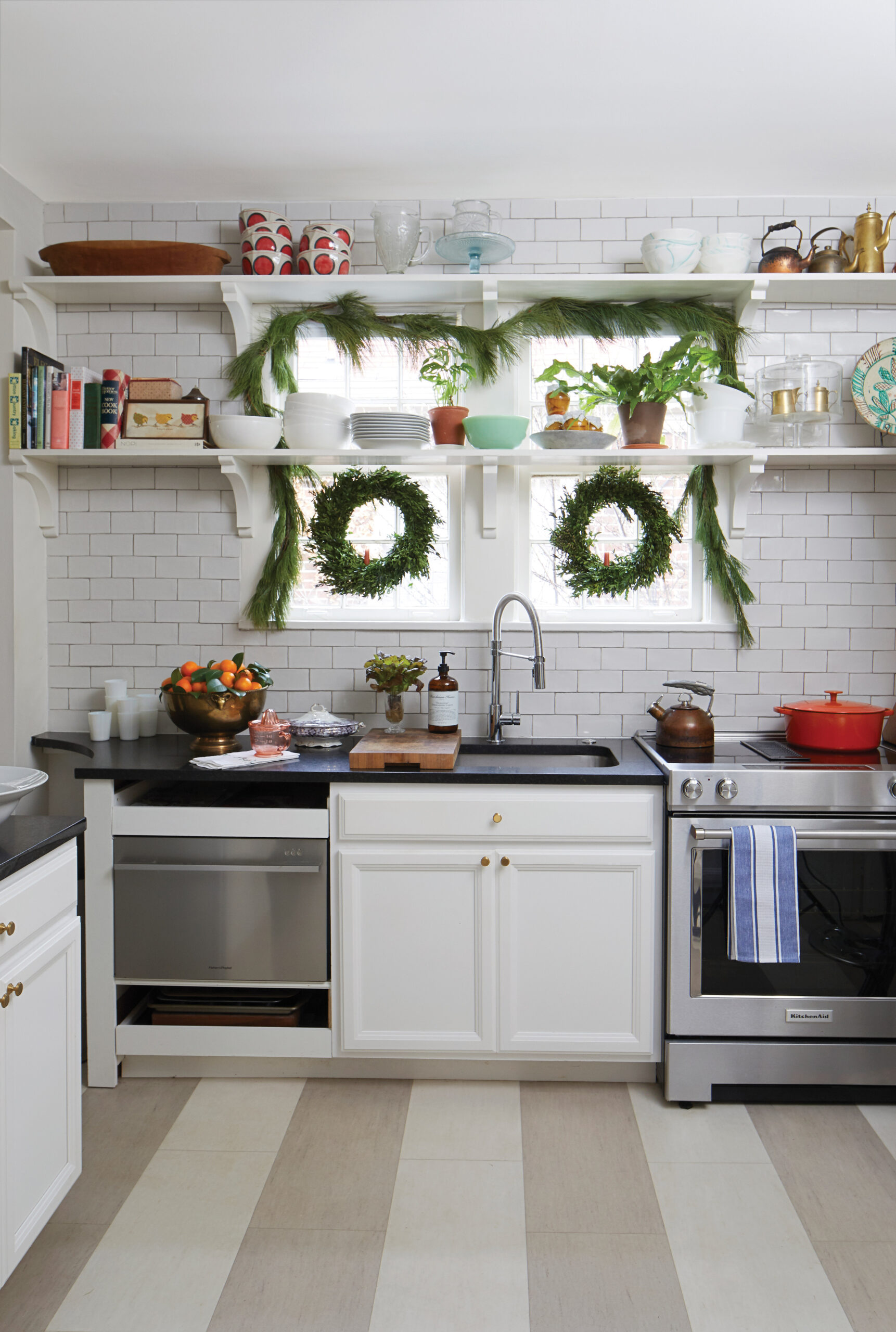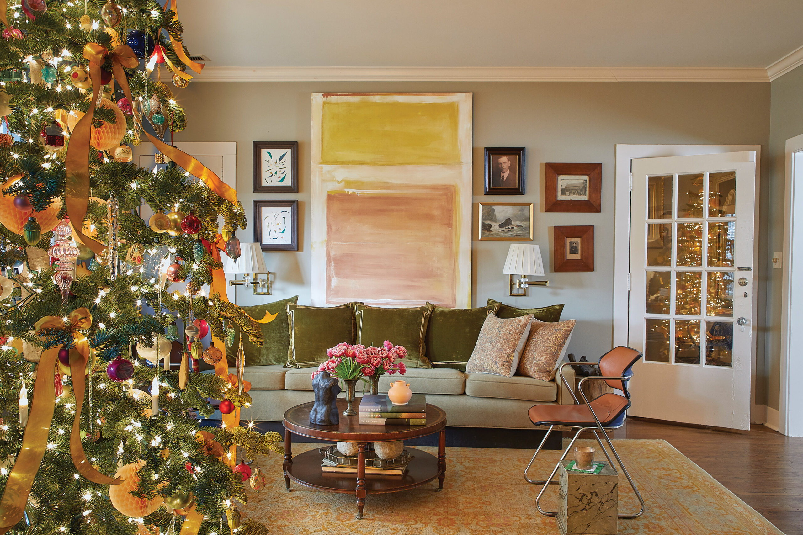 But that artful handiwork really has nothing on the couple’s aforementioned holiday creations. Together, Mark and Jay string garlands, craft wreaths, and arrange luscious florals. “We have a habit of one of us starting a project and the other finishing it,” Mark says. “It’s our form of teamwork.” Mixed into the already cozy, layered rooms, the decorations seem to beckon guests to sit and stay awhile, which is exactly what Mark and Jay want friends and family to do—especially during the holidays.