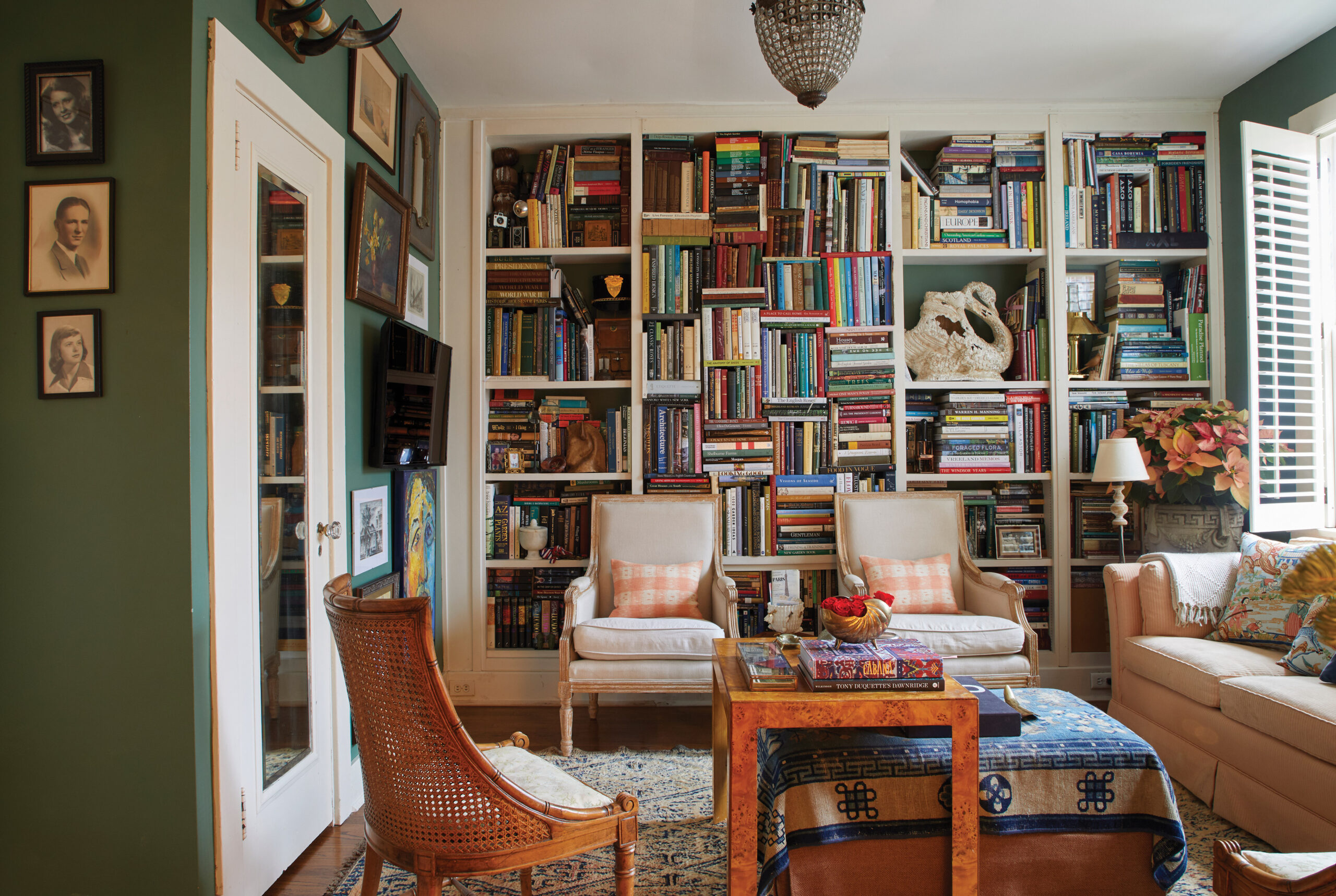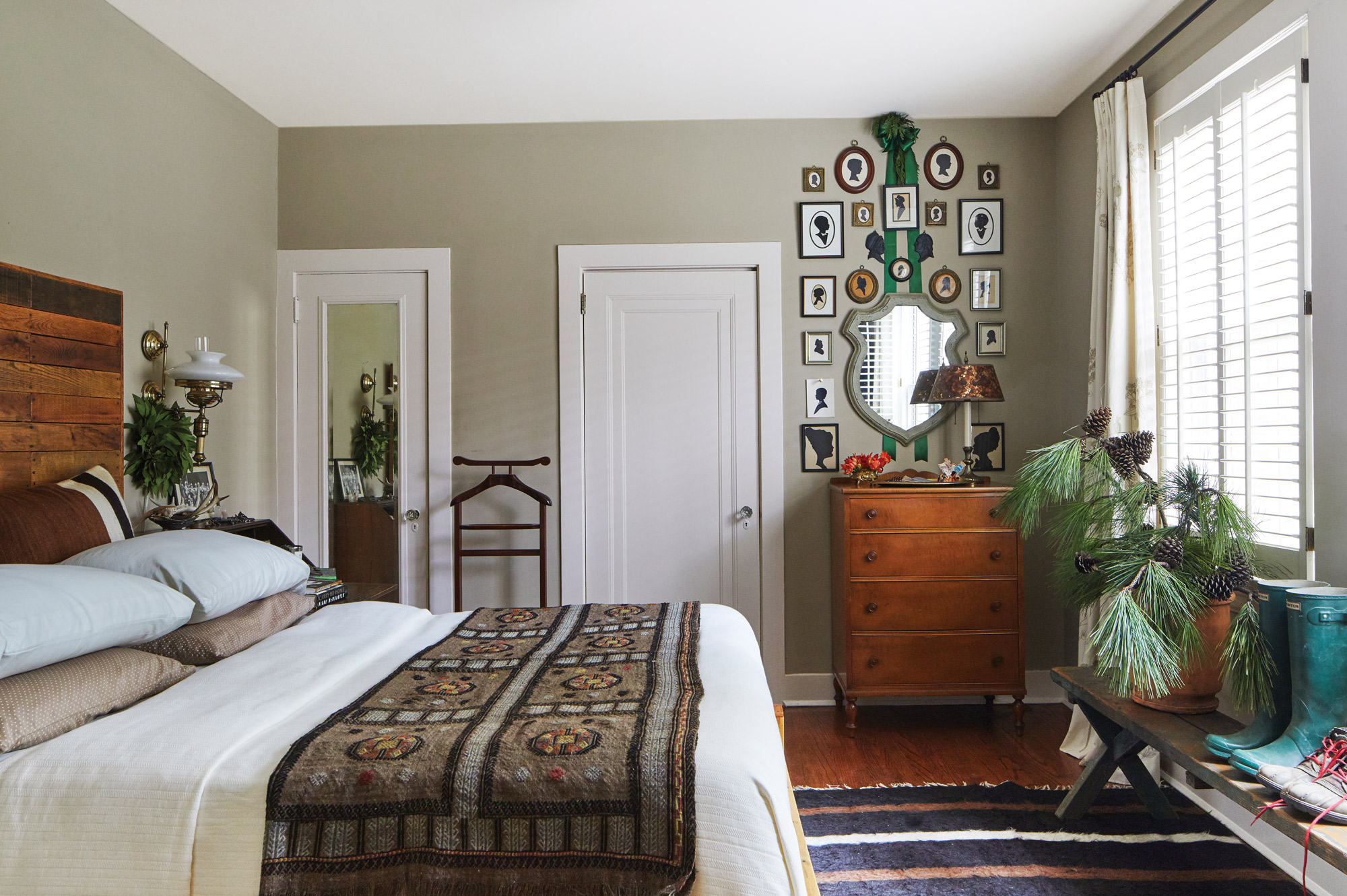 That philosophy also wonderfully sums up the design aesthetic the couple has applied to their home’s décor. Built in 1915 as the Clairmont Terrace apartments, the townhome boasts they-don’t-make-‘em-like-they-used-to details such as high ceilings and handsome millwork. And to showcase those old bones, Mark and Jay developed a simple, whole-house palette of mossy greens, rich browns, and rusty oranges. The earthy scheme makes an elegant backdrop for a bounty of inherited antique furniture and old family photos. As Mark says, “There’s nothing like creating rooms that remind you of where you’ve come from.”