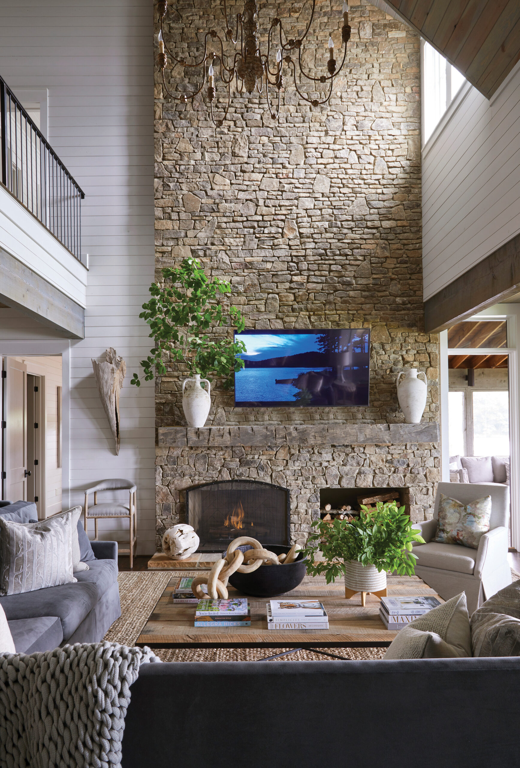 This Lake Martin home designed by Ashley Gilbreath features a floor-to-ceiling rustic stone fireplace design that brings elements of the outdoors in. “The house slips seamlessly and respectfully into the landscape and incorporates the surroundings into the living space,” says Ashley. See More of this Home