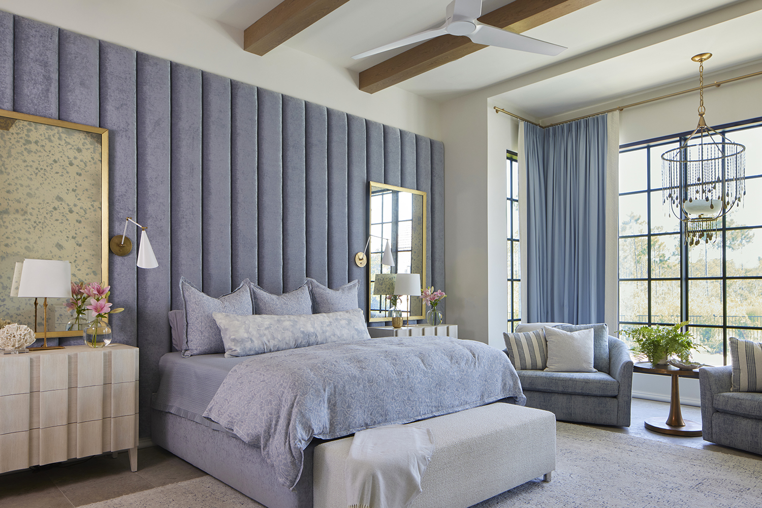 The home’s subtle blend of ease and sophistication is perhaps most eloquently executed in the primary suite, where the clients’ directive was the feel of a five-star hotel. Shades of slate blue and soft grays are a study in serenity. A recessed bay with tall windows carves out a sunny nook large enough to accommodate two oversized chairs and a focal chandelier. Floor-to-ceiling blue linen draperies frame views of the landscape while exposed wooden beams animate the ceiling. The crowning jewel is a luxurious upholstered wall that serves as a commanding headboard. Symmetrical bedside tables and sleek, gold-framed mirrors are pretty and practical.