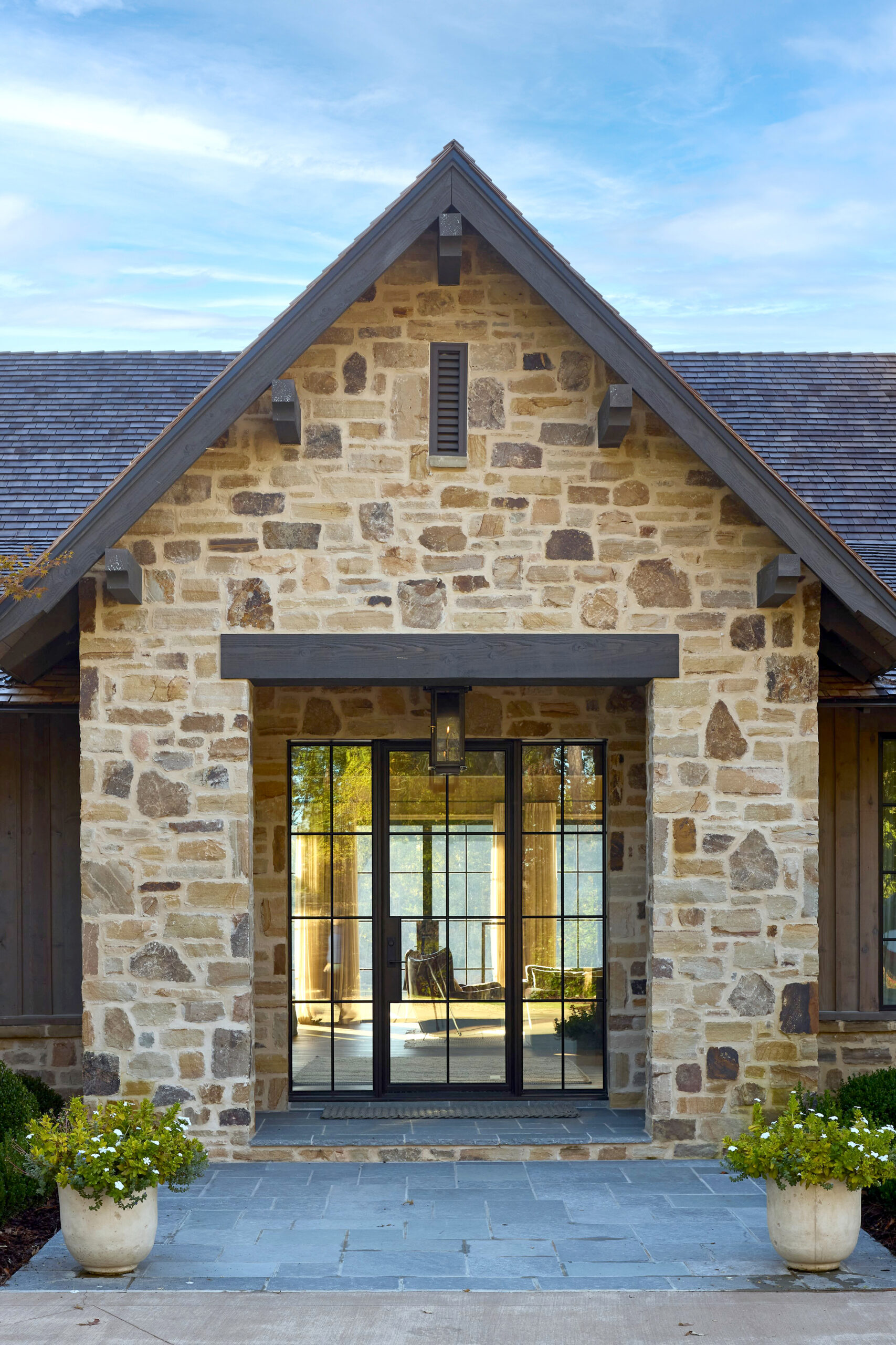 - Opt for an earthy palette. Hard finishes exhibit natural materials such as stone, wood, and metal. The designer replicated these inside and out for a harmonious continuum. Furnishings and upholstery exhibit lake hues: dark mossy green, watery blues, and sandy neutrals.