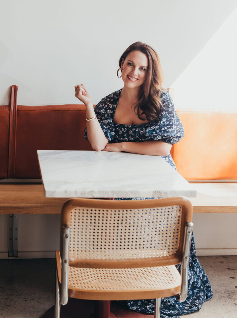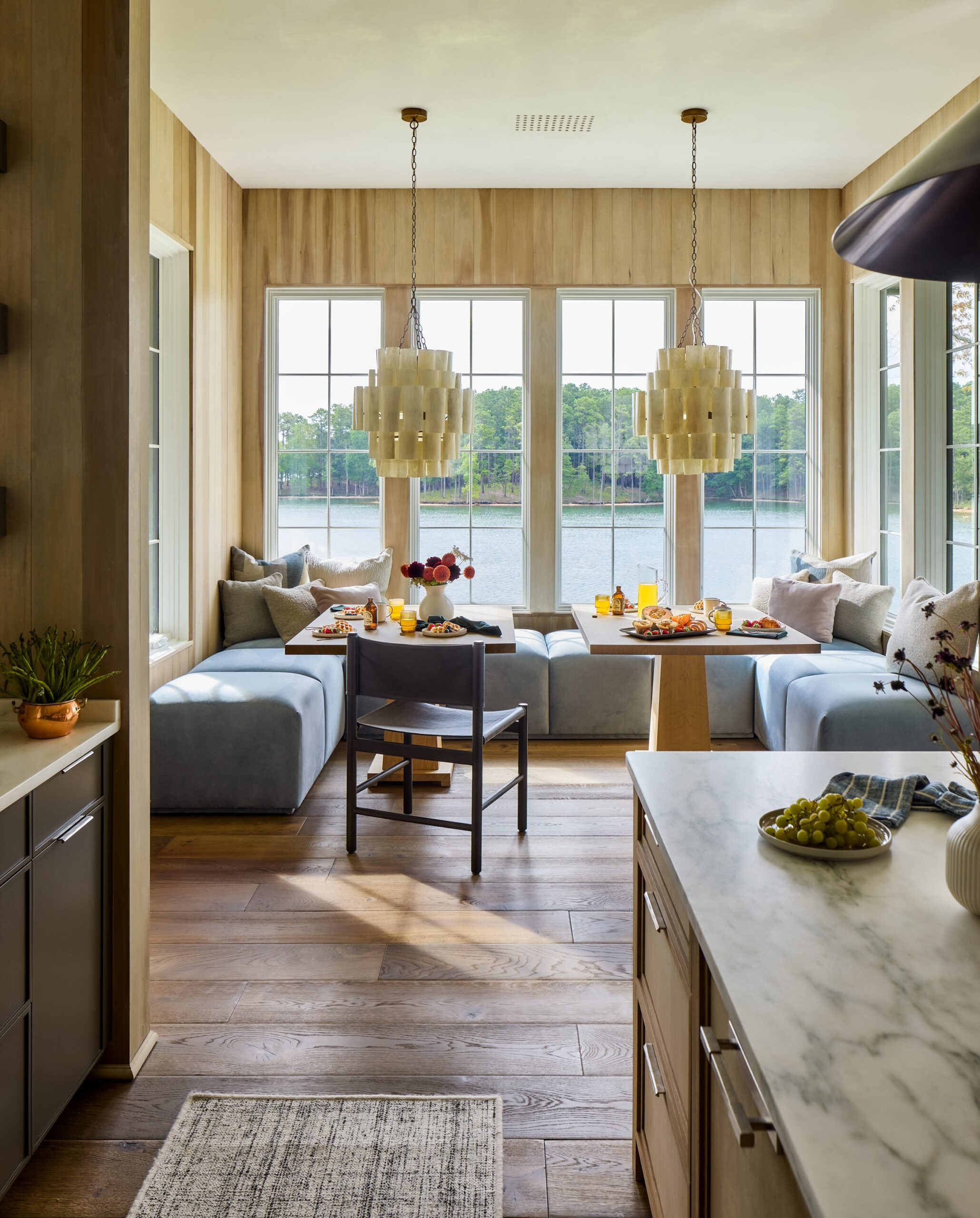 CENTER Laurin designed the breakfast nook with both comfort and versatility in mind. A custom U-shaped banquette—upholstered in a soft, water-inspired performance velvet and crafted by MDM Design Studio—offers the depth of a sofa, making it suited for morning coffee or curling up with a book. Dual pedestal tables allow for easy flow through the space, while a pair of chandeliers adds sculptural interest.