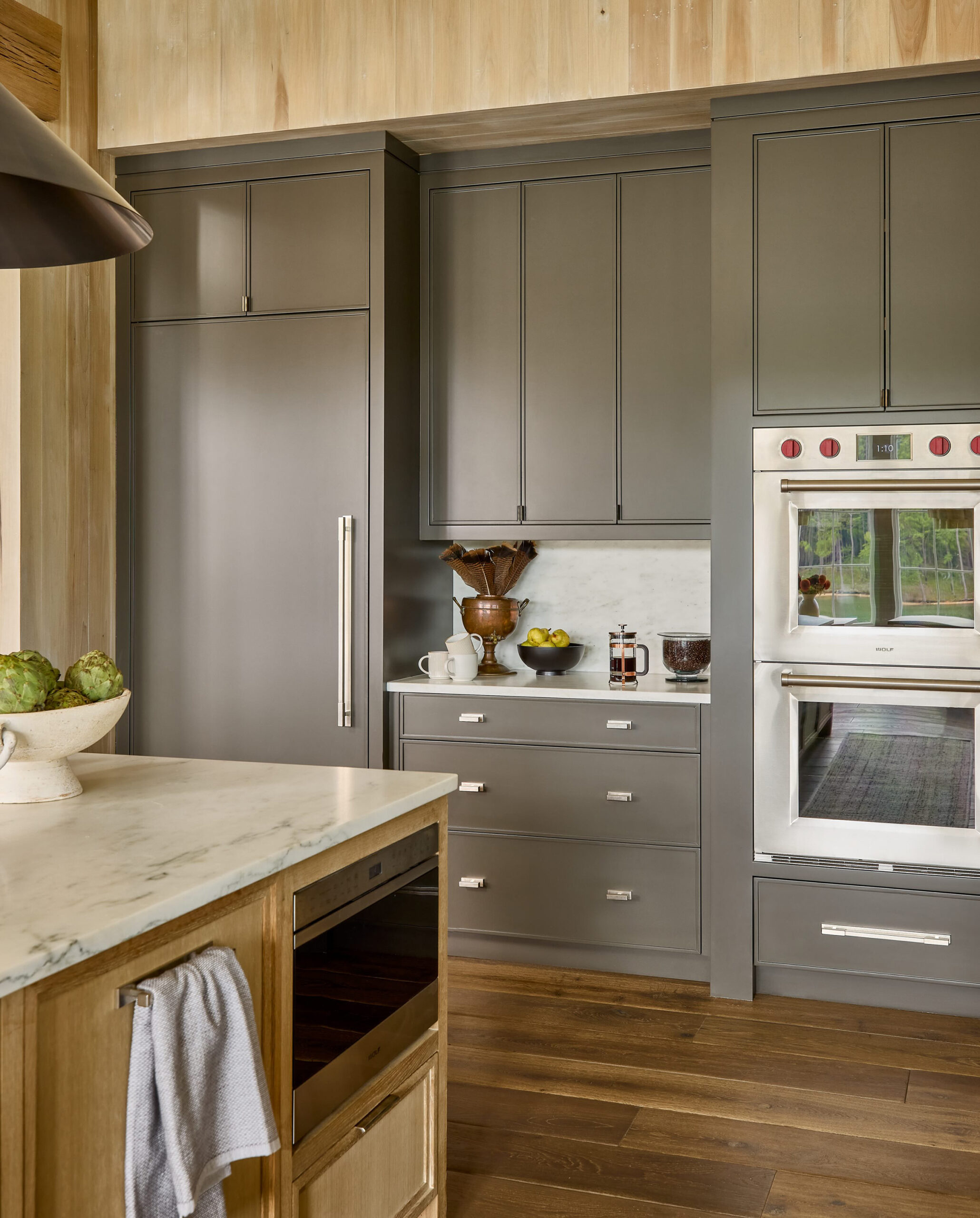 In the main living spaces, Laurin found the ideal balance by using natural materials in a way that feels elevated rather than expected. Poplar planking covers the foyer, living room, and kitchen walls, as well as the vaulted living room ceiling, while moss rock frames the fireplace and the stone mantel. Sleek concrete sconces, antiqued hardware, and bronzed accents bring a refined polish to the kitchen. “I wanted the materials to feel purposeful and cohesive—not competing for attention,” Laurin says. “It’s about being really discerning, using each element purposefully so it feels thoughtful and classic rather than trendy or overdone.”