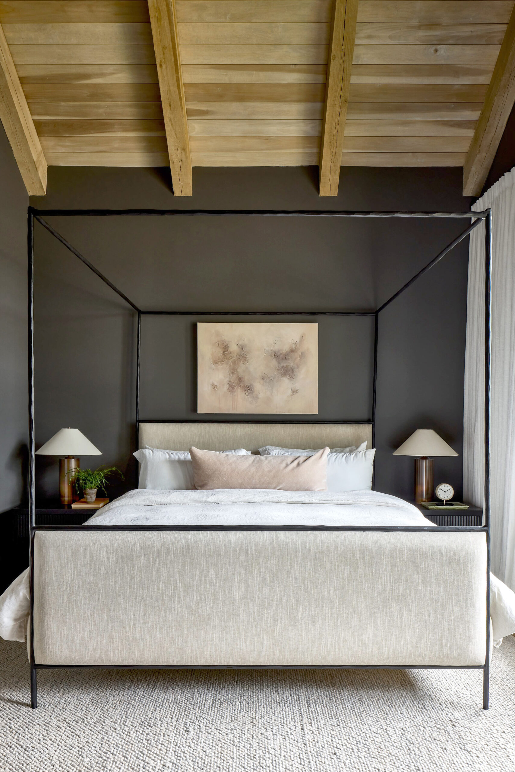 The designer carried that sensibility into the bedrooms, where wood-paneled ceilings, linen headboards, and textured rugs add warmth, paired with antique brass lamps and steel light fixtures for a refined touch. “It still feels like a lake house,” Laurin says, “but in a way that’s uniquely theirs—comfortable, collected, and just right for their family.”
