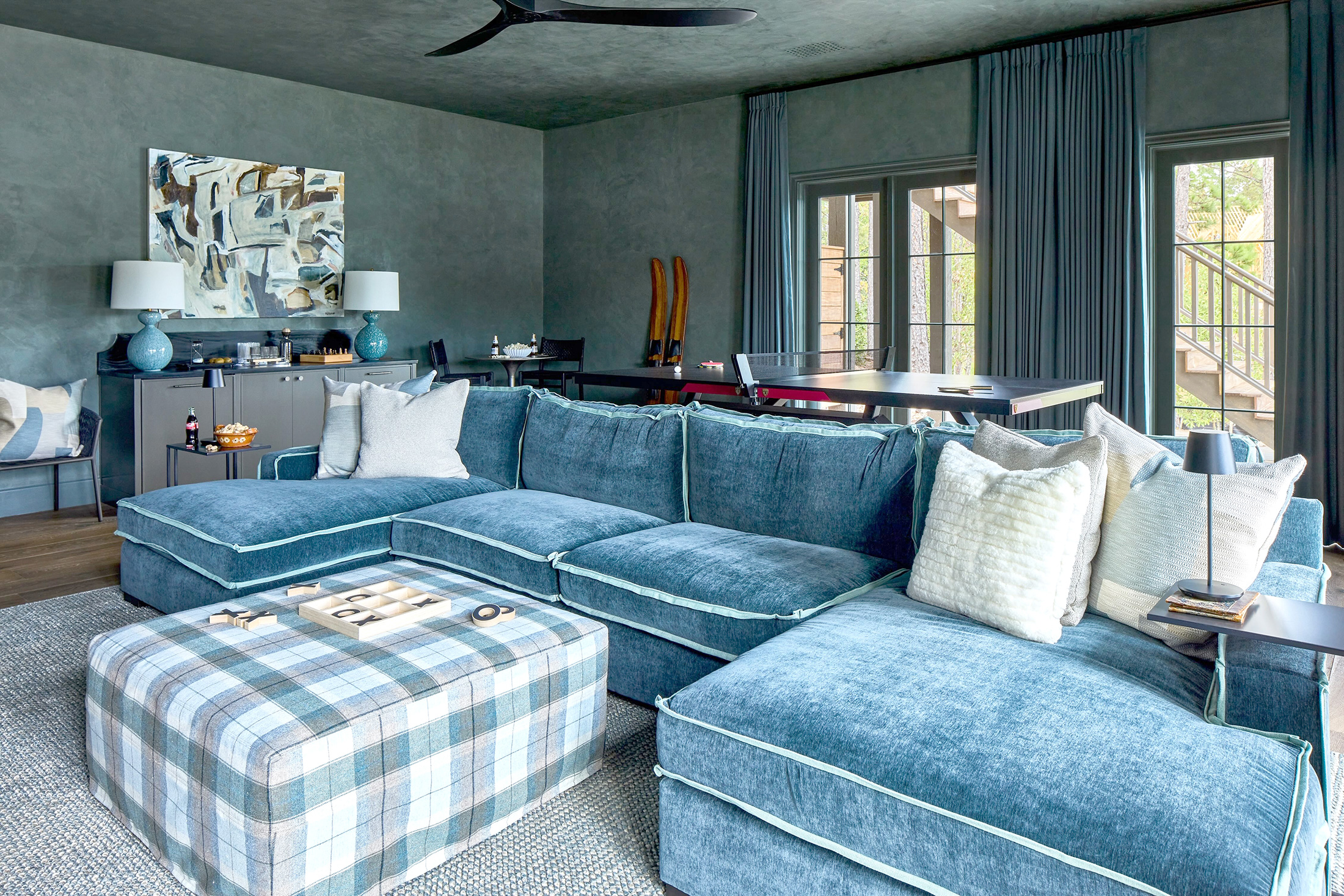RIGHT Designed for gatherings of family and friends, the living room is a cozy haven layered with soft textures and rich materials that still allow the lake to take center stage outside the expansive windows. Dark green mohair sofas, a bouclé ottoman from Patina, and leather recliners from Seibels offer plenty of places to perch. A custom light fixture made of delicate milk glass adds intrigue, especially when seen from the water at night.