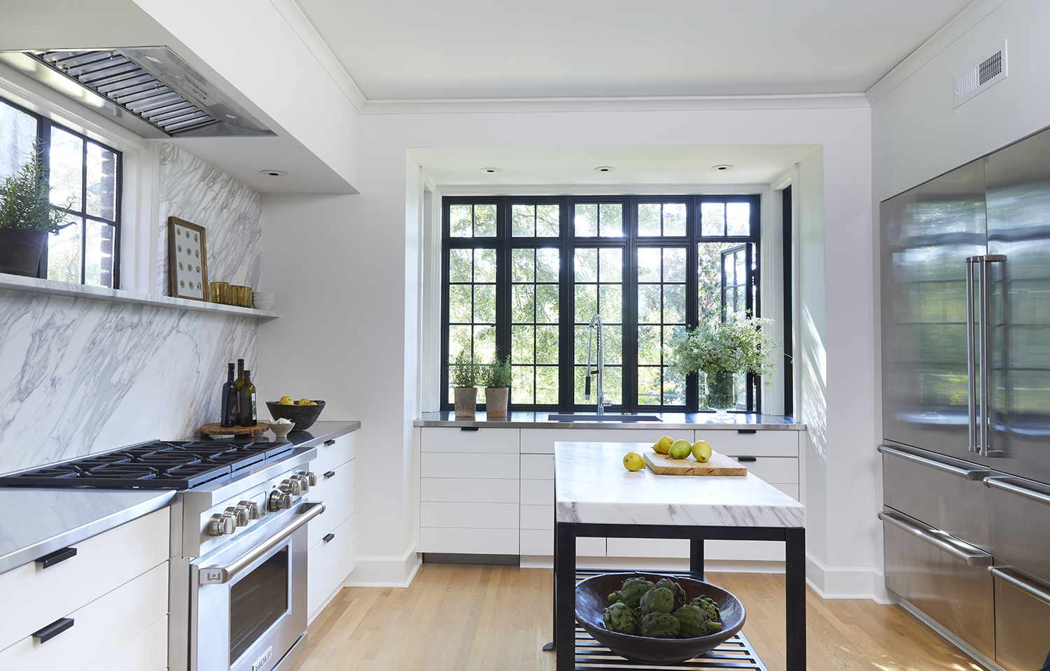 While the footprint of the home remained more or less intact, the interiors received a complete overhaul. The kitchen renovation was the most dramatic—the dark, cramped space that was formely filled with dated appliances is now flooded with stylish appointments and natural light. “I always wanted a view, and I had a vision that it could be realized in this house,” says Anna. To replace the existing tiny kitchen window—and open up the room to views—Jimmy designed a small box bay with multi-paned casement windows custom-fabricated by Bessemer Glass. The new windows match the originals, ensuring a seamless integration.