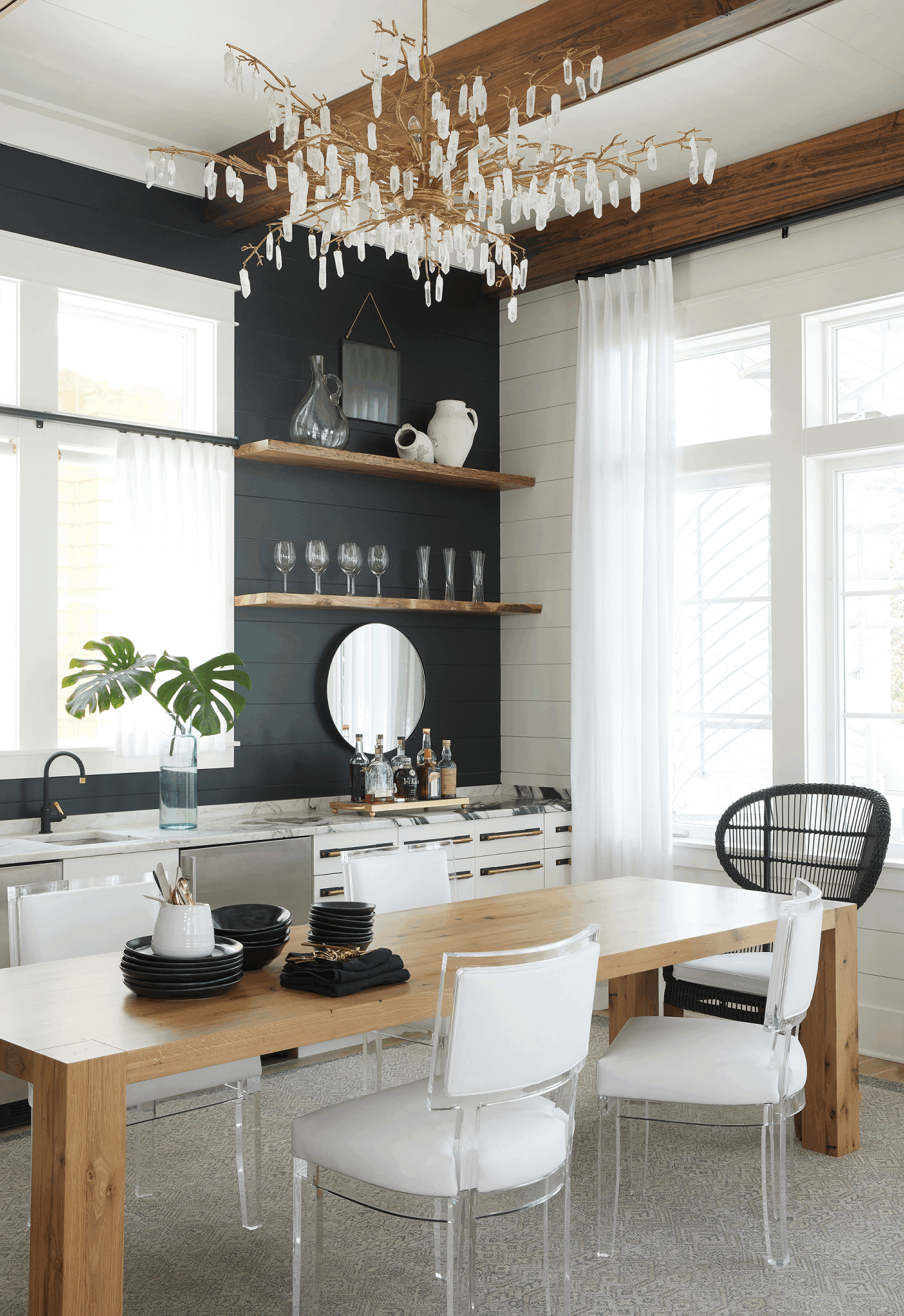 The Result: These structural elements add an immediate modern farmhouse attitude to tall ceilings, preventing the generous proportions from feeling cold or uninviting.