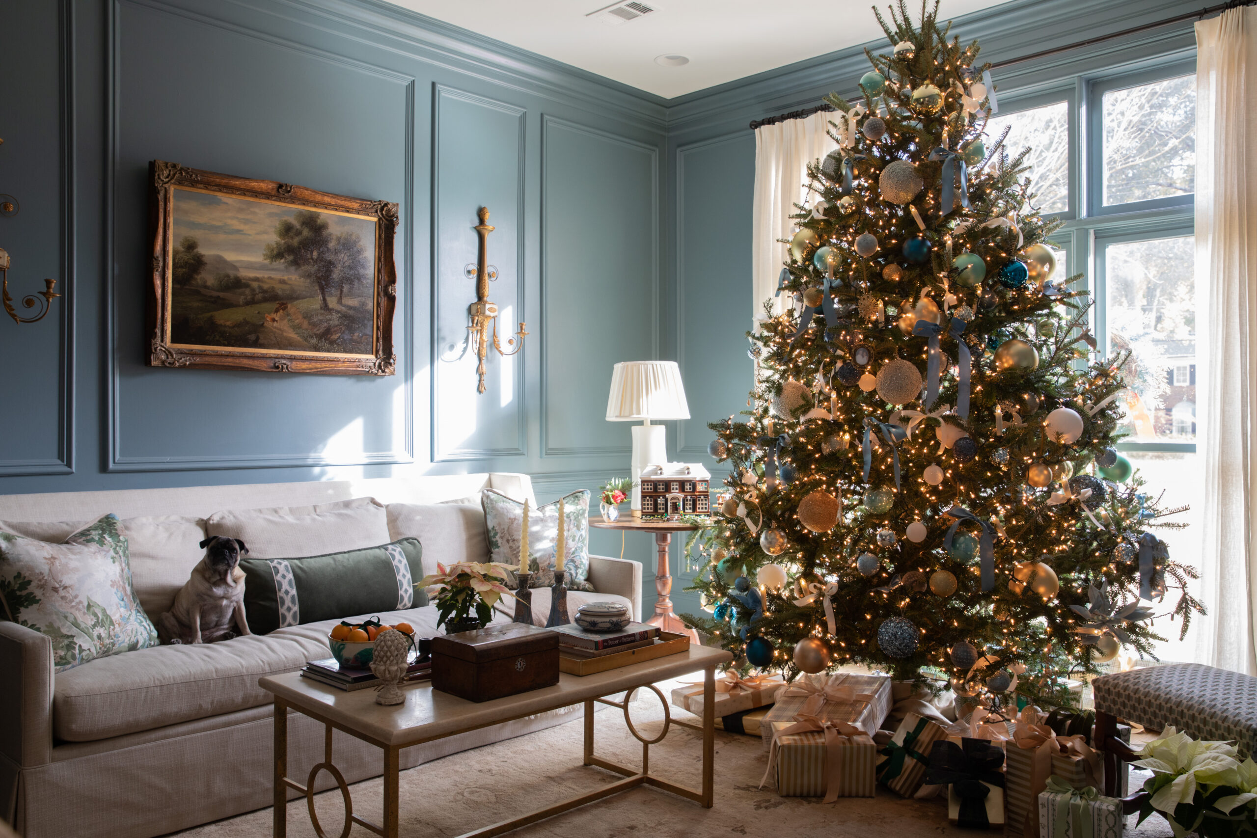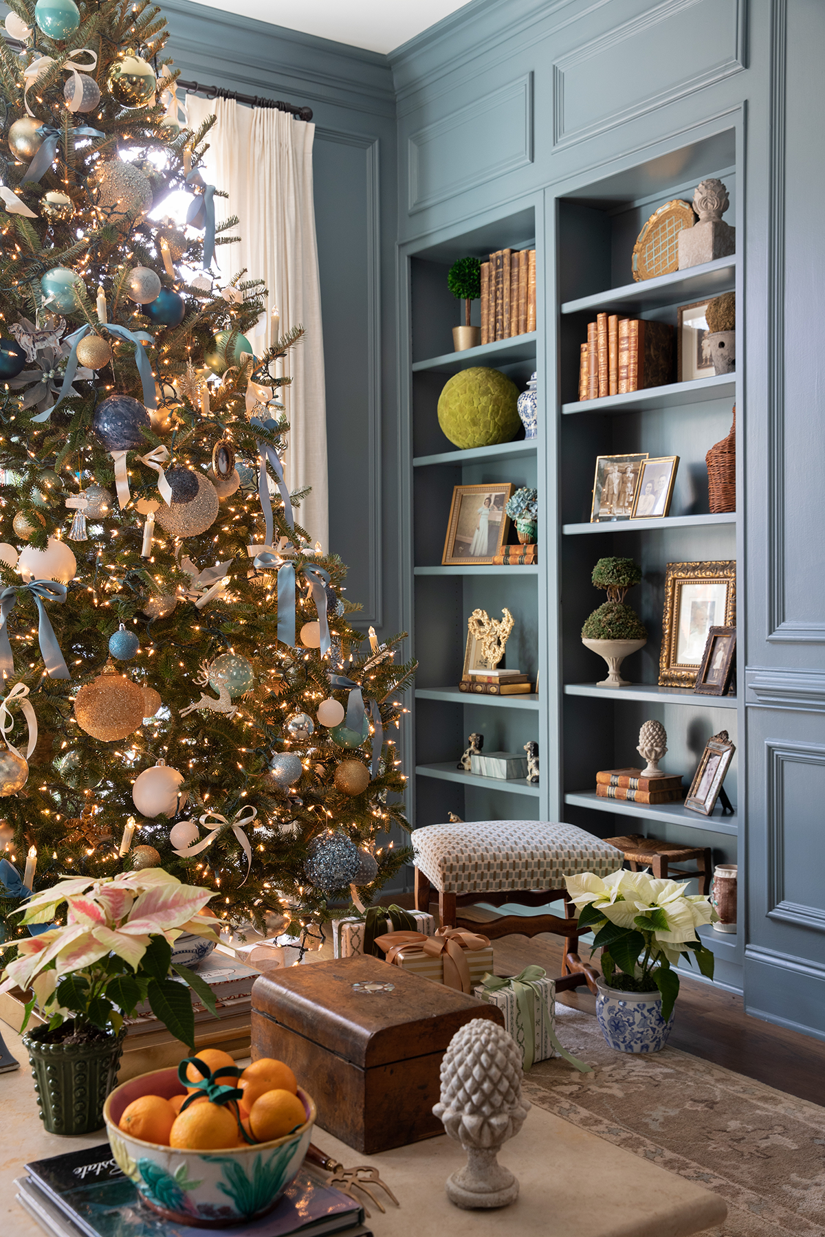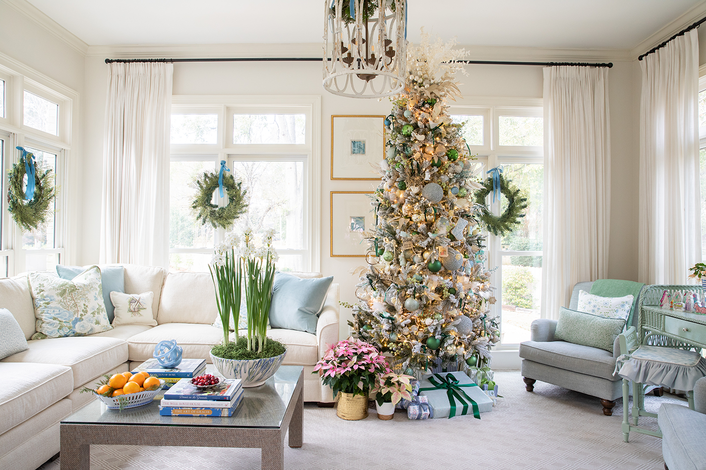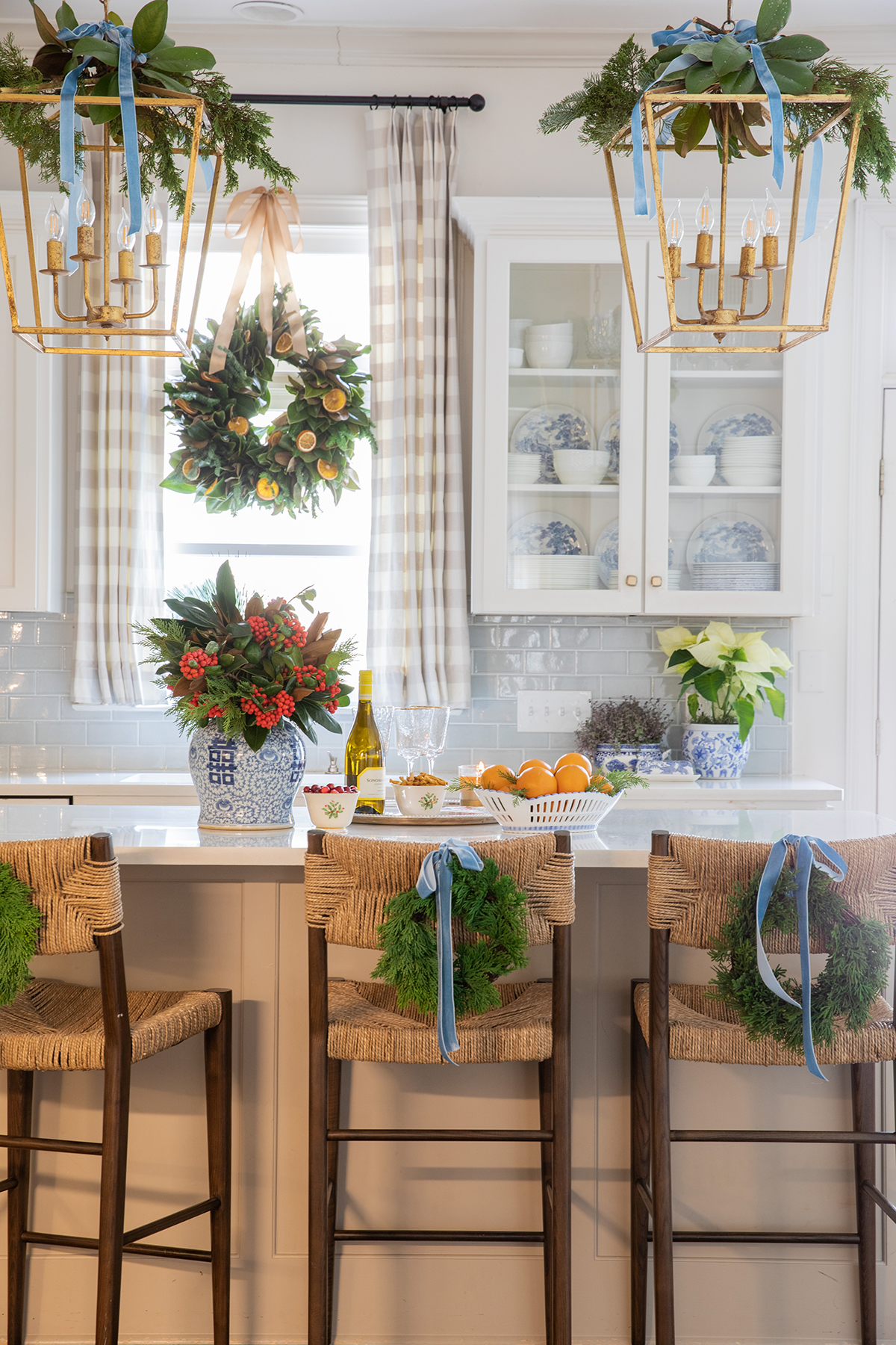 What started on the dining room chandelier soon moved to the small tree in that room where Tori hangs her chinoiserie ornament collection and then to other places throughout the house. “It sets off all the greenery,” the designer says of the fresh garlands, wreaths, and cuttings she uses on mantels, chairs, windows, and light fixtures, as well as in arrangements on tables and counters.