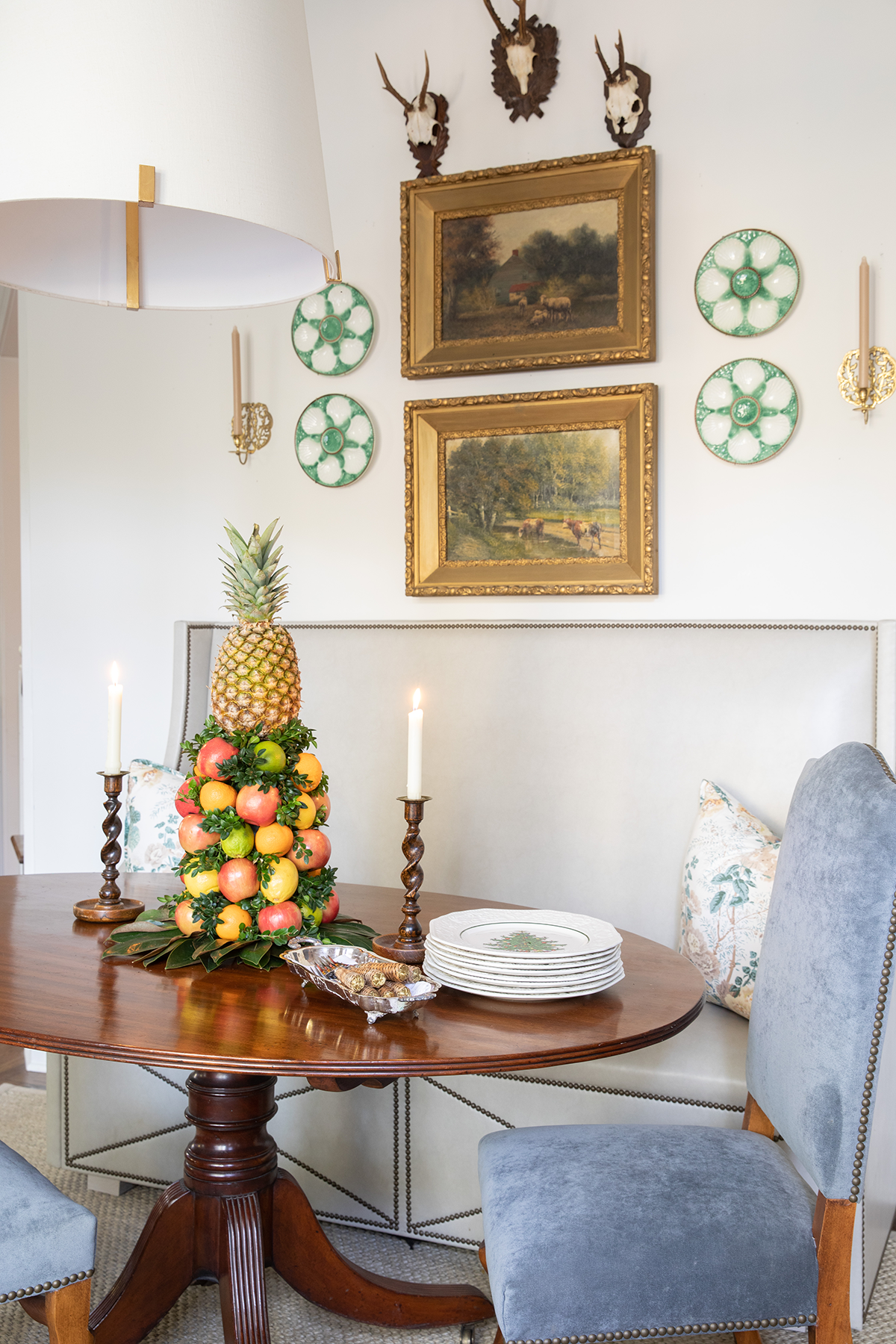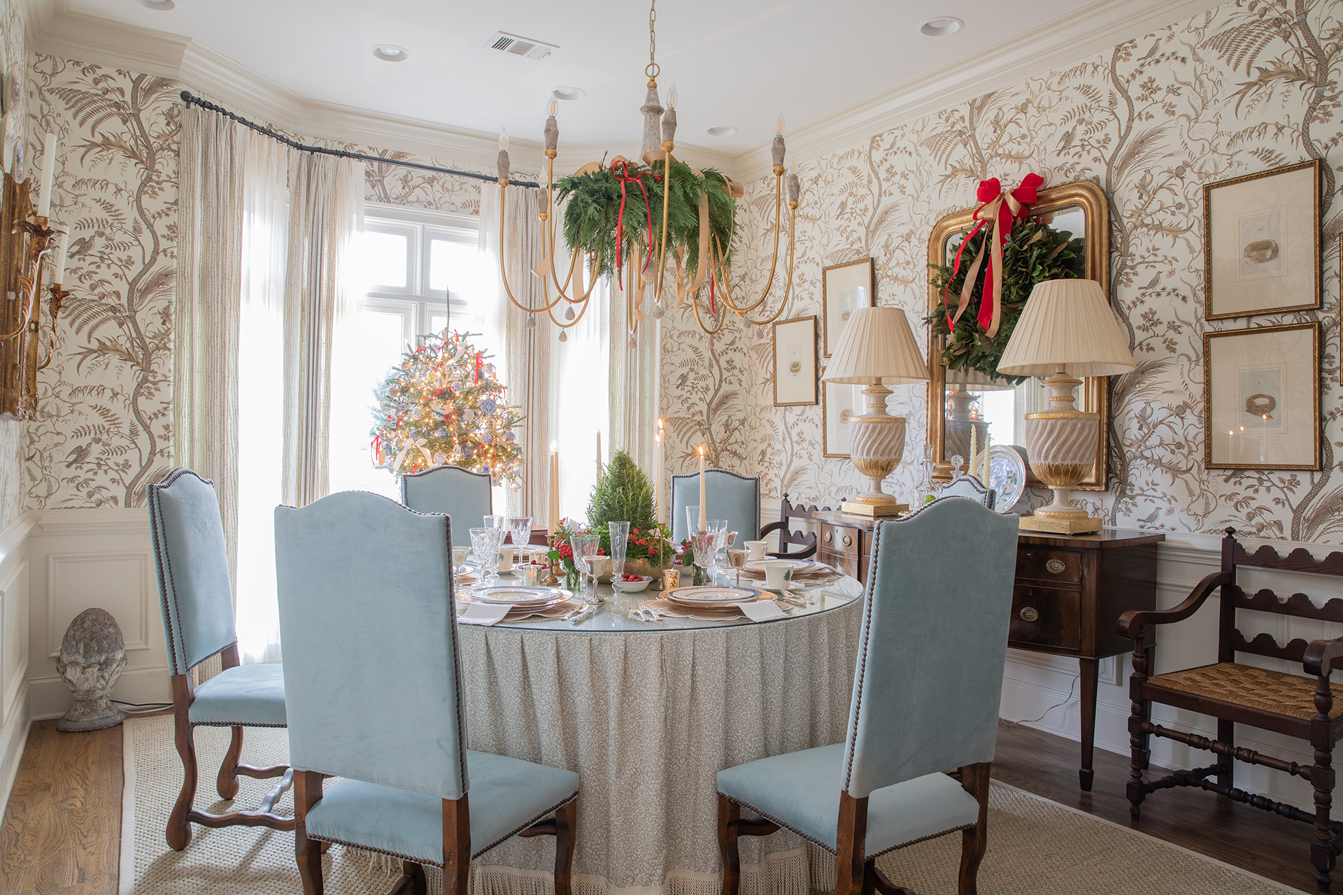 “In the bay window I always have a small live tree with Chinoiserie ornaments,” Tori says. The room’s furnishings are a mix of antiques: Sheepbone chairs purchased at Cottage Collection in Montgomery and recovered; a pair of rattan-seat armchairs from an online auction; mirror and sideboard from Scotts Antique Market in Atlanta.