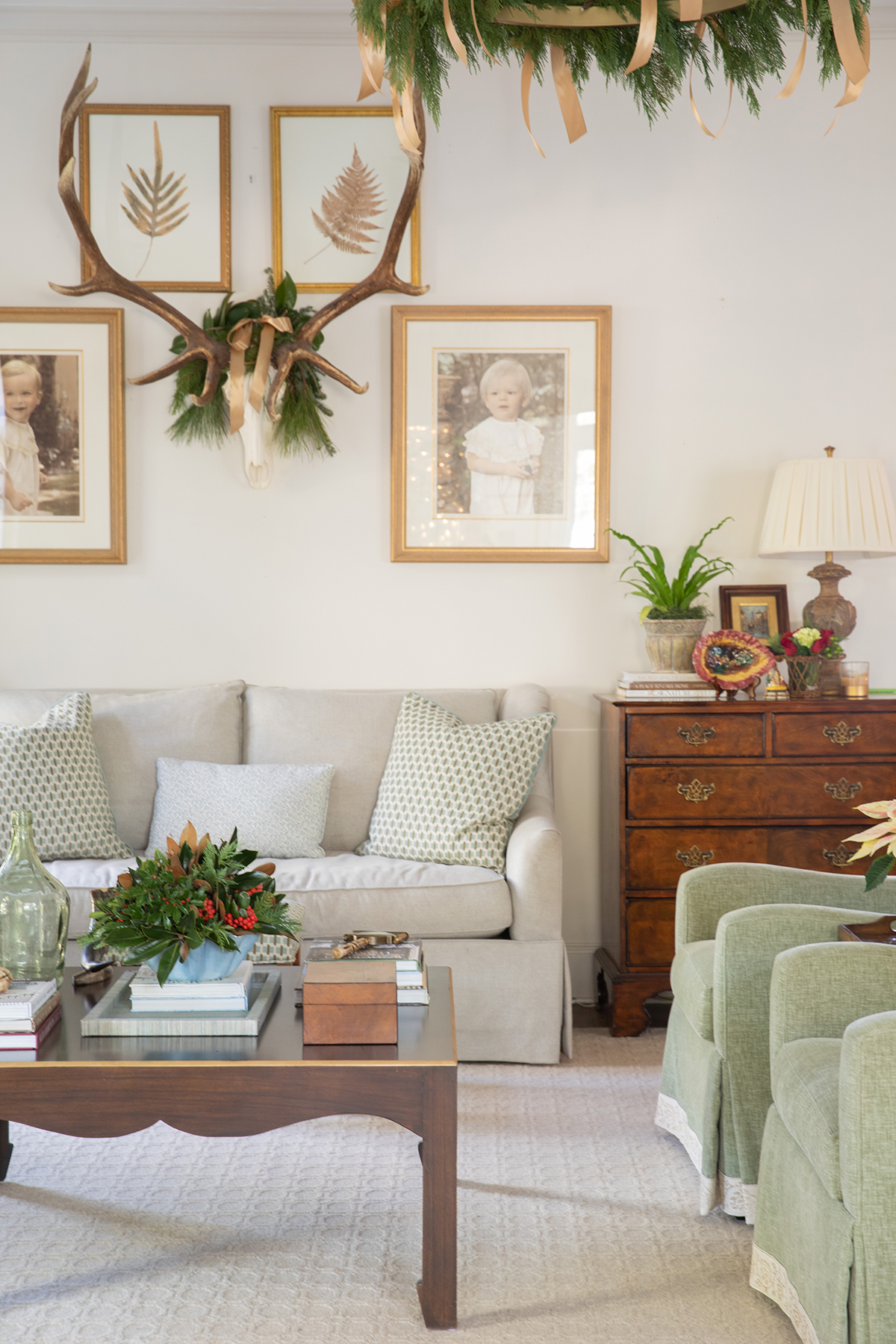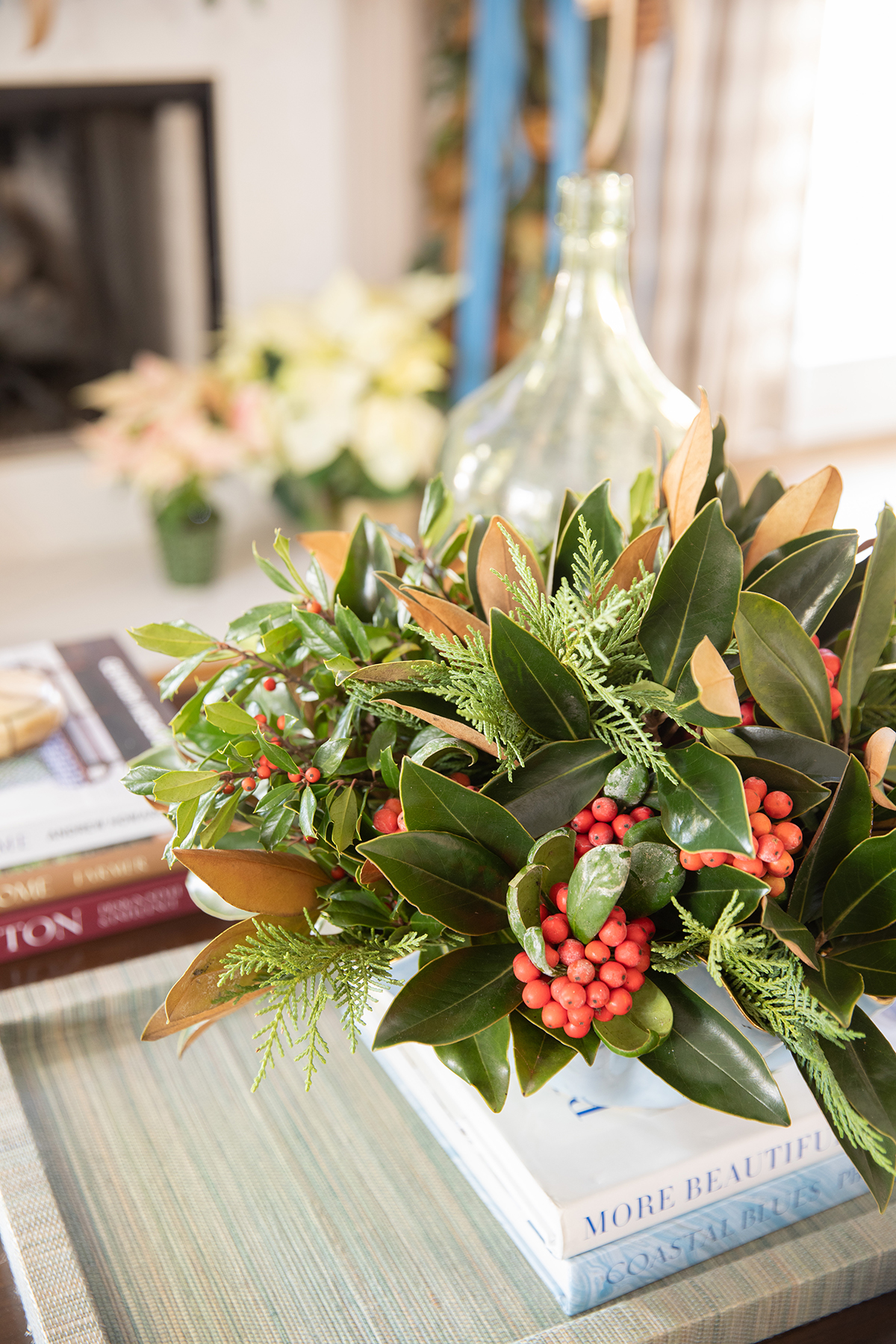 While Tori turns to a talented craftsman at Montgomery’s Curb Market for lush garlands and a local market for wreaths, a tree, and more, she creates the swags and arrangements herself. “I love to decorate with cuttings and berries from the yard,” she says. Tori asks permission to snip on the properties of family and friends to get the right mix of varieties. You just have to ask!” she assures. One neighbor has what Tori describes as “some sort of holly bush alive with red berries more than you could ever clip in your life.” The addition of those berries in Tori’s arrangements carries the ribbon’s scarlet thread through every room.